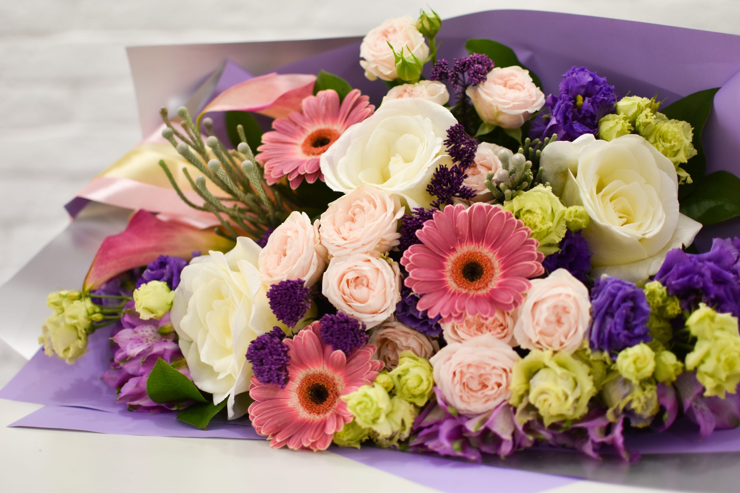 + Free ShippingBouquet diseñado especialmente para trasmitir alegría, amor y felicidad por la combinación de colores en cada flor. Hecho con gerberas, calas, statis o belladona y rosas.