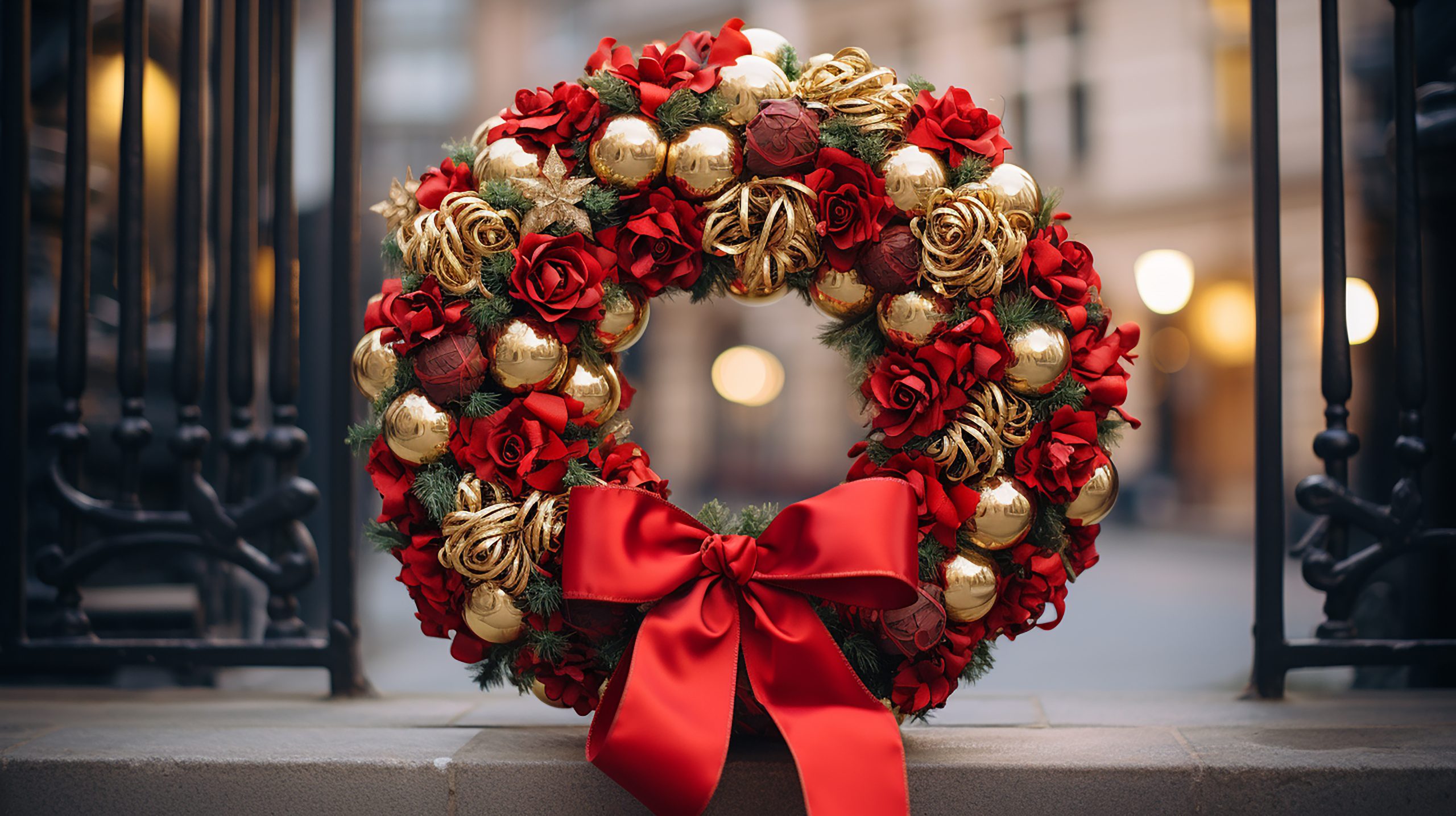 + Free ShippingCorona navideña para pared o puerta con bolas navideñas y rosas de seda, con moño de cinta de tela.