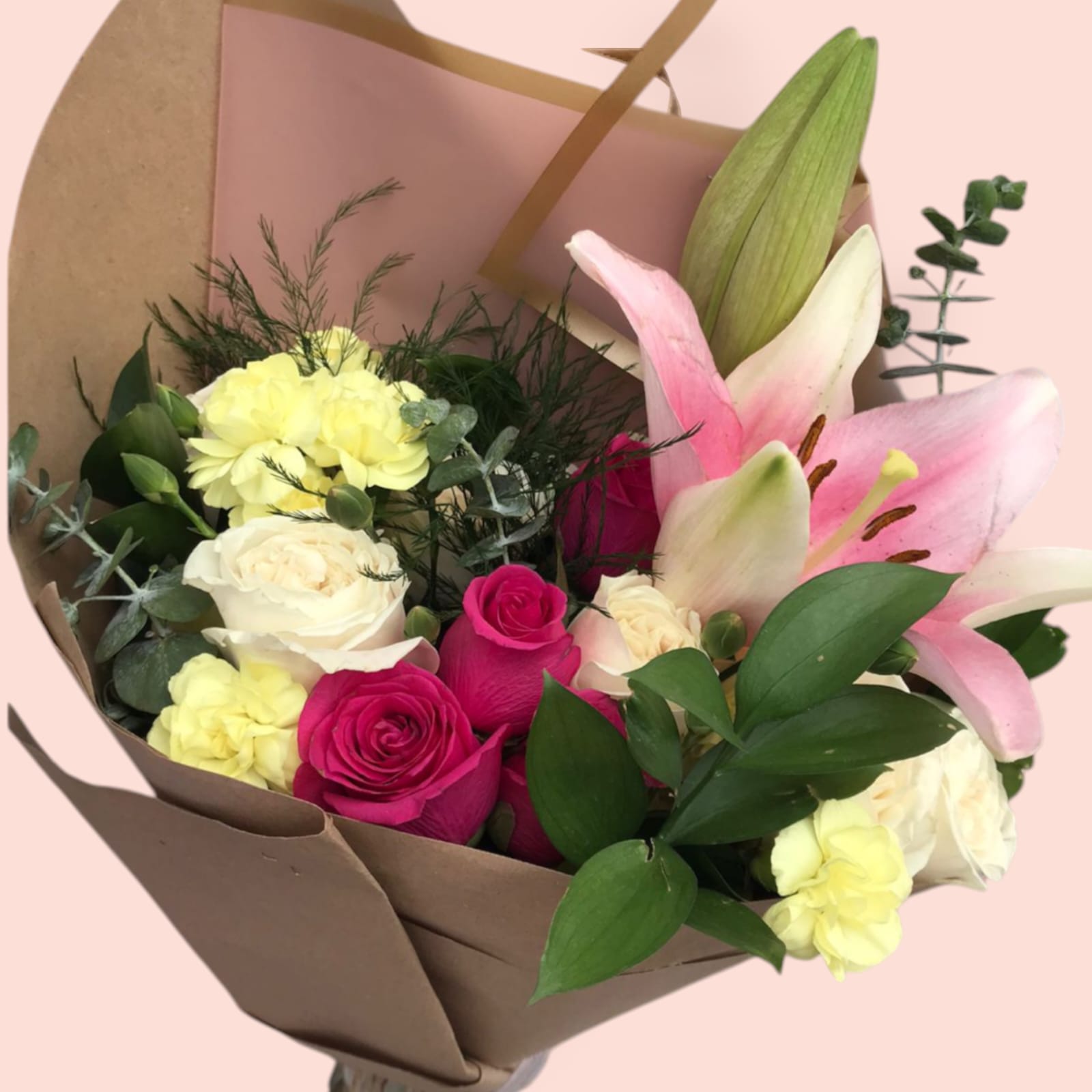 Para tener en cuenta: Los colores de las flores pueden que no sean exactos, se buscará uno similar al de la foto, en caso de no haber disponibilidad de alguna de ellas buscaremos lo más parecido para conservar el diseño, la estructura y el tamaño del arreglo.
