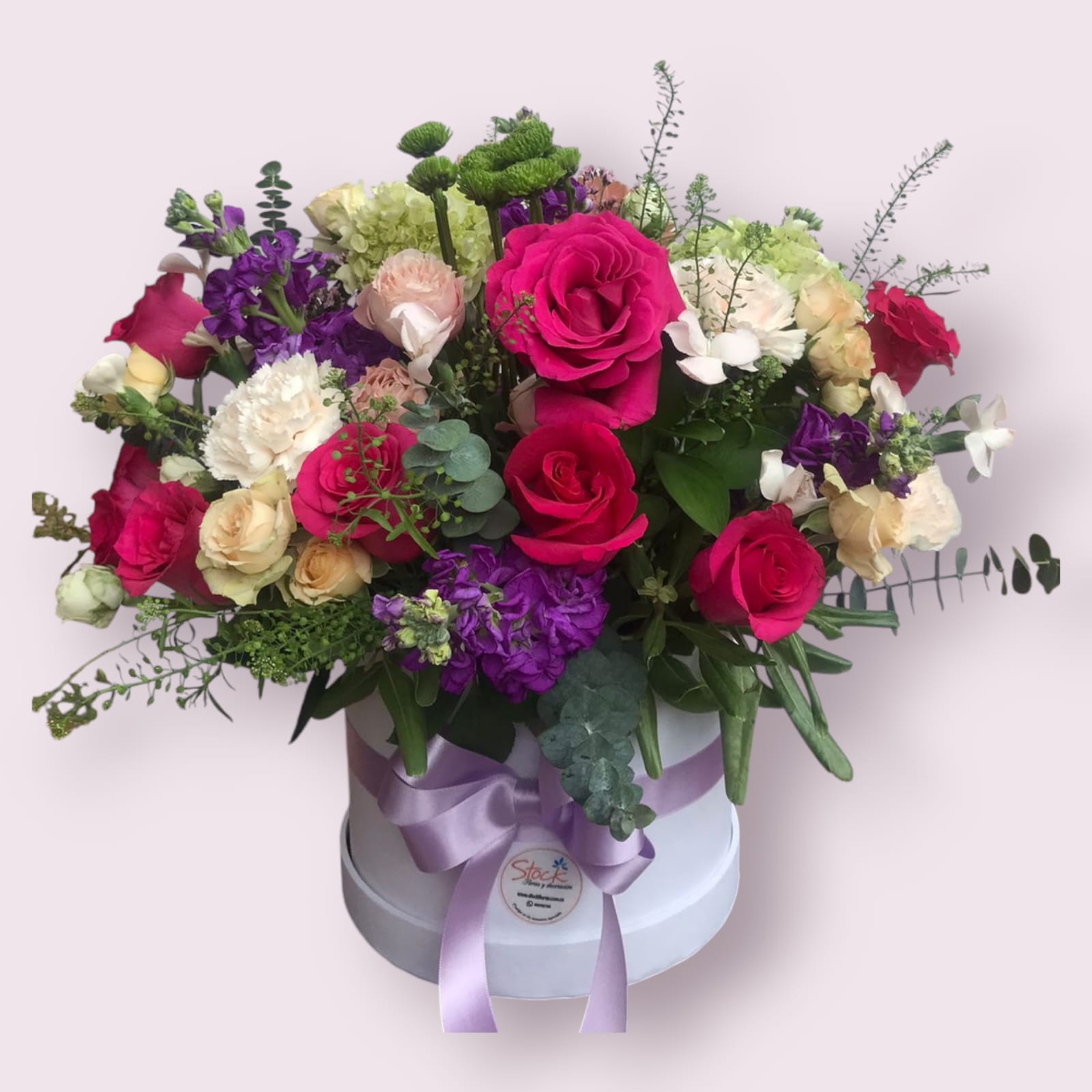 + Free ShippingCaja redonda mediana con rosas, rosa mini, y flores de temporada. La paleta de colores de estas flores inspiran alegría. Caja especial para regalar a esa persona que amamos o apreciamos.